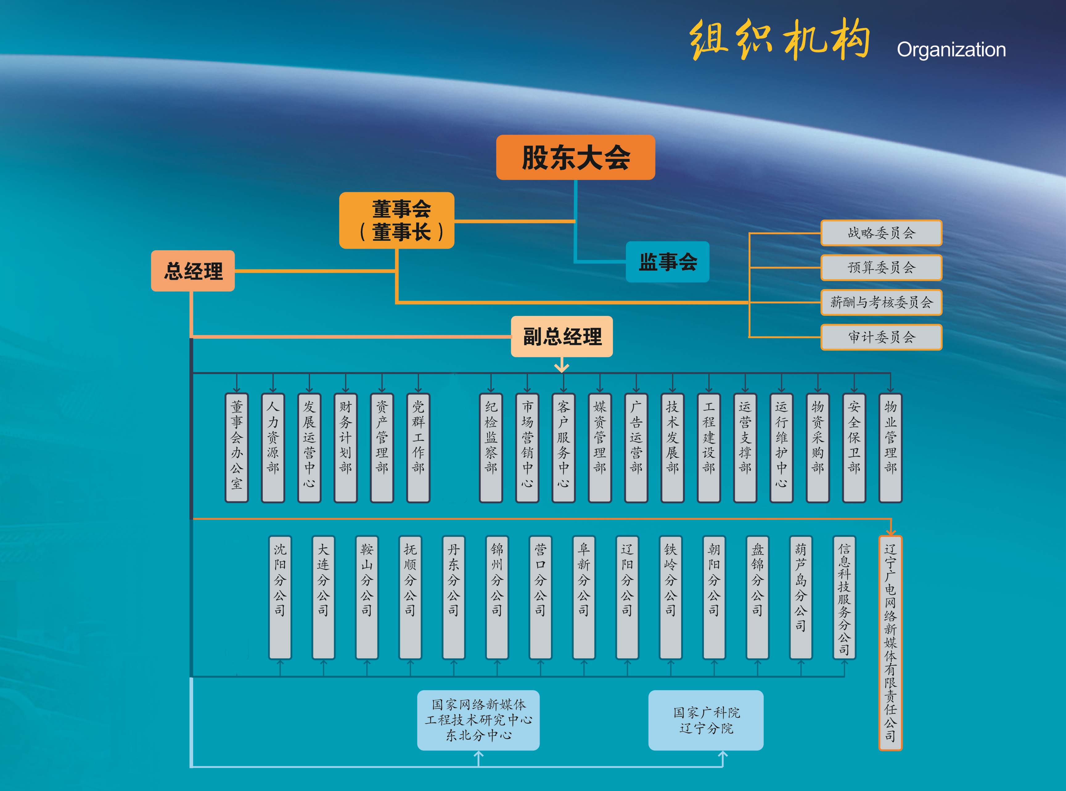 中國廣電遼寧網絡股份公司(簡稱中國廣電遼寧公司)前身為成立于2010年2月的北方聯合廣播電視網絡股份有限公司,系中央國有文化企業——中國廣電網絡股份有限公司省級子公司、遼寧省國有文化高新技術企業,是按照現代企業制度打造的集網絡建設、傳輸、運營及多功能開發與應用為一體綜合網絡運營商。