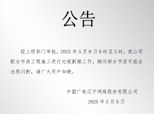 經上級部門審批,2025年5月8日0時至5時,我公司配合市政工程施工進行光纜割接工作,期間部分節目可能會出現閃斷,請廣大用戶知曉。