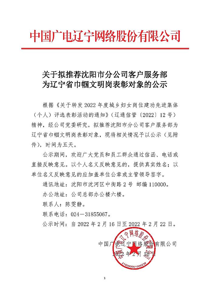 根據《關于轉發2022年度城鄉婦女崗位建功先進集體(個人)評選表彰活動的通知》(遼通信管〔2022〕12號)精神,經公司黨委研究,擬推薦沈陽市分公司客戶服務部為遼寧省巾幗文明崗表彰對象,現將相關情況予以公示(見附件),時間為五天。