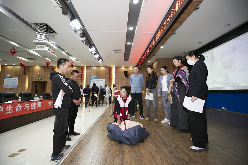 遼寧省紅十字應急救護志愿服務隊趙俊秀現(xiàn)場為學員演示?心肺復蘇(?CPR)步驟?