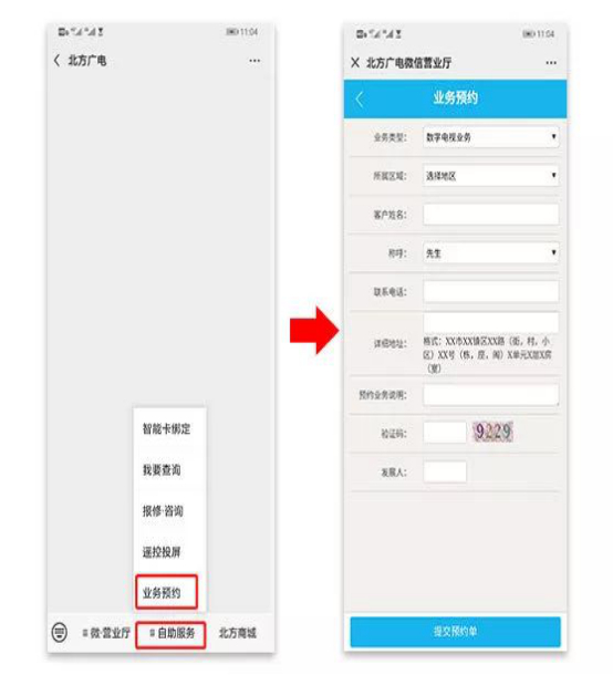 關注北方廣電微信服務號,選擇菜單下方“自助服務—業務預約”,即可預約您想辦理的業務。