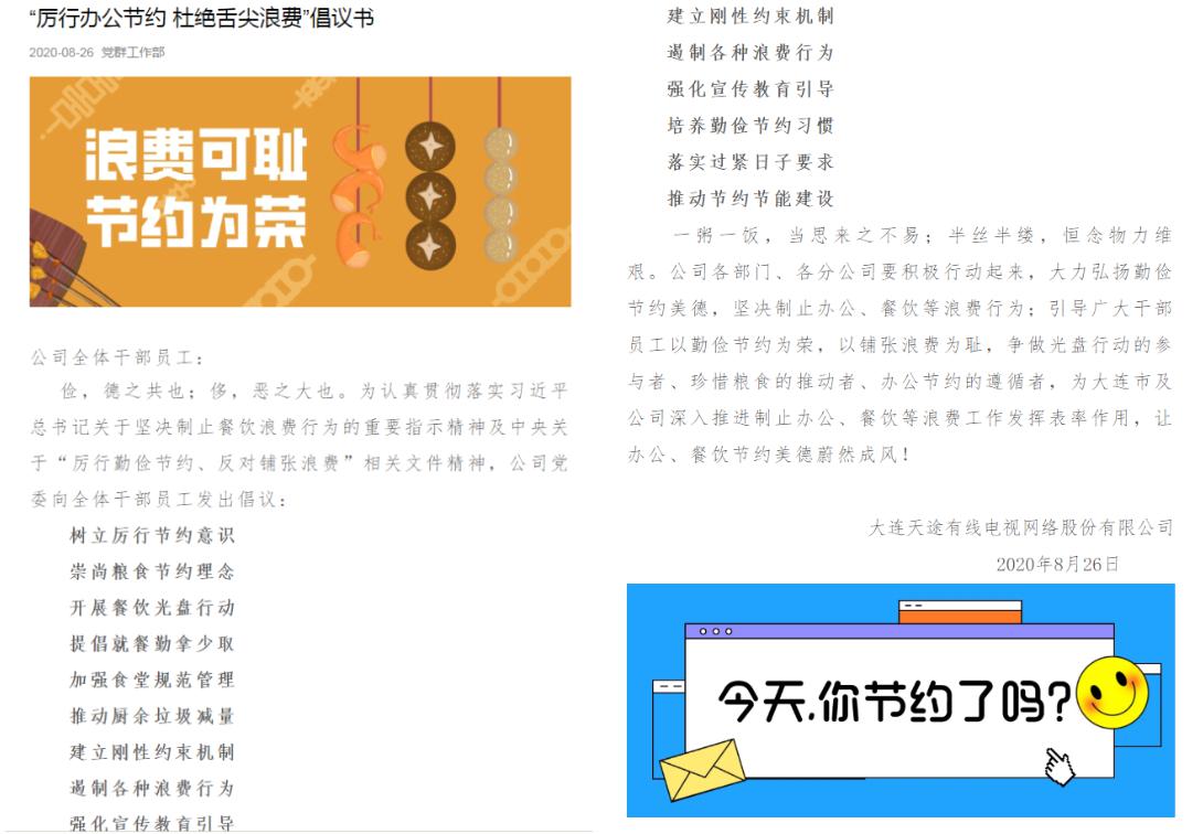 為貫徹落實習近平總書記提出的厲行節約反對浪費重要指示批示精神,大力弘揚中華民族勤儉節約的傳統美德,營造人人參與、重視、踐行節約文化的濃厚氛圍,8月24日,大連天途公司黨委開展了以“厲行辦公節約 杜絕舌尖浪費”為主題的活動,并向全體干部員工發出倡議,號召大家在工作生活中以節約為榮,以浪費為恥。
