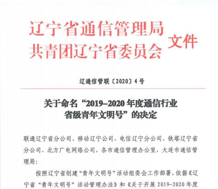 2020年7月初,遼寧省“青年文明號”活動組委會啟動了創建活動。5個月的時間,全省多家通信行業企業精心組織實施、積極參評活動。最終經過活動組委會審核評選,遼寧省通信管理局和共青團遼寧省委員會決定命名北方廣電網絡公司信息科技服務分公司呼叫運營中心、北方廣電網絡公司沈陽分公司鐵西區域二公司北一路營業廳等10個通信行業集體為“2019-2020年度通信行業省級青年文明號”。