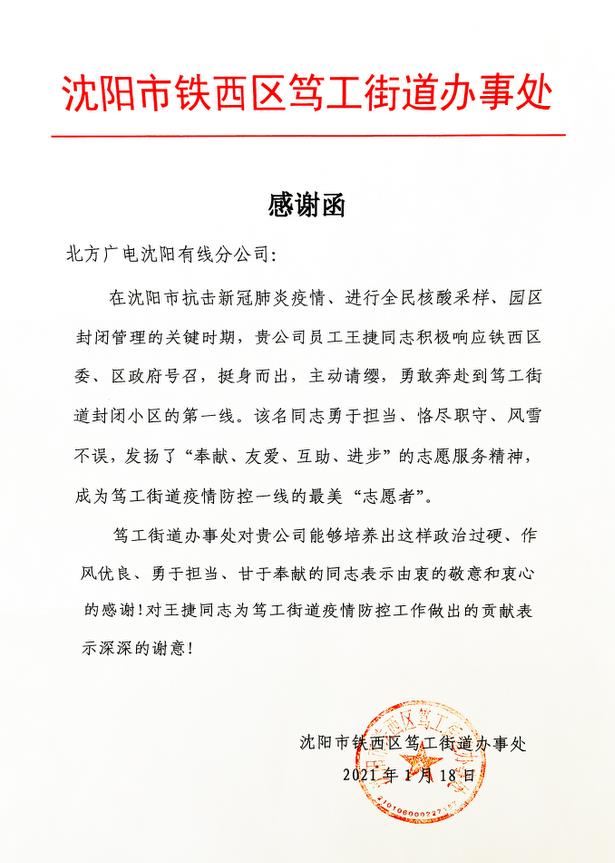 1月19日,北方廣電網絡公司沈陽分公司接到沈陽市鐵西區篤工街道發來的感謝函,對公司員工王捷同志在沈陽市抗擊新冠疫情期間做出的突出貢獻表示由衷的感謝。