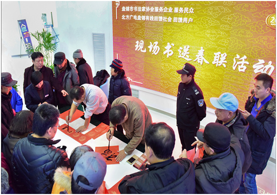 “猴去靈動在,雞來福氣生”,為貼近客戶,節(jié)前造勢,營造歡樂祥和的新年、春節(jié)假日期間營銷宣傳氛圍,2016年12月29日,北方廣電網(wǎng)絡公司盤錦分公司、盤錦市書法家協(xié)會聯(lián)合舉辦“書法名家現(xiàn)場送春聯(lián)”活動。十八位書法家同時揮毫潑墨為用戶和市民送上丁酉年的第一份新春祝福。