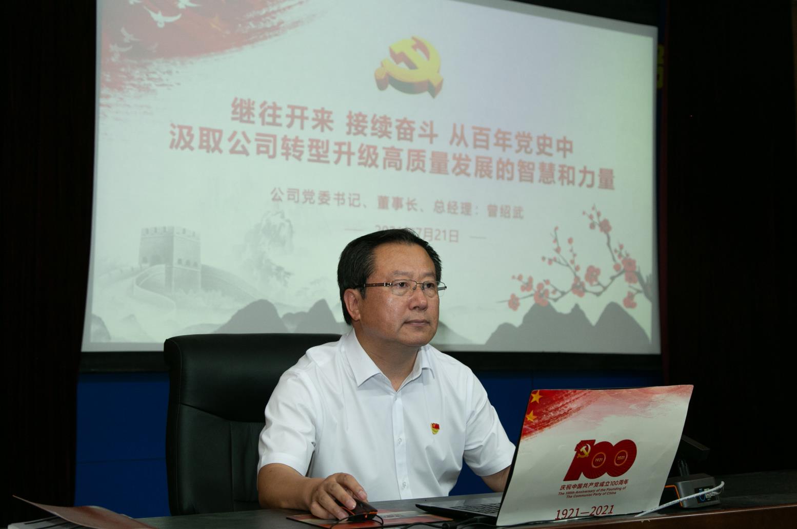曾紹武董事長結合公司實際,以“如何把握習近平總書記‘七一’重要講話的精神實質和豐富內涵?”“如何從黨的非凡歷程中建立起對實現中華民族偉大復興的信心?”“如何從黨的紅色故事中賡續精神血脈,在新時代展現央企員工新氣象、新作為?”“如何把黨史學習教育成果運用到加強黨的建設、破解公司改革發展難題中,進入新角色、擔當新重任、實現新升級?”四個問題為切入點,圍繞“聚焦學史明理,進一步感悟真理偉力,堅守初心擔使命”“聚焦學史增信,進一步領略非凡歷程,堅定信仰強信念”“聚焦學史崇德,進一步賡續精神血脈,昂揚奮進新時代”“聚焦學史力行,進一步強化擔當作為,接續奮斗譜新篇”四個主題展開論述。他指出,學習好、領會好、貫徹好習近平總書記“七一”重要講話精神,是公司當前和今后一個時期的首要政治任務,公司各級黨組織要結合正在開展的黨史學習教育,精心謀劃、周密安排、統籌推進,推動學習宣貫工作取得實效,要做到“五個深刻領會”。一是深刻領會實現第一個一百年奮斗目標在中國共產黨奮斗史、新中國發展史、中華民族文明史中的里程碑意義。二是深刻領會對“一個主題”和“四個偉大成就”的認識。三是深刻領會對偉大建黨精神的認識。四是深刻領會對以史為鑒、開創未來“九個必須”的認識。五是深刻領會對踏上新的趕考之路的認識。