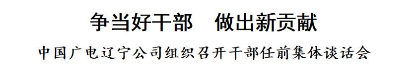 2021年8月24日上午,中國廣電遼寧網(wǎng)絡(luò)股份有限公司(簡稱中國廣電遼寧公司)組織召開了干部任前集體談話會。公司黨委書記、董事長、總經(jīng)理曾紹武,黨委委員、副總經(jīng)理張曉鈞,黨委委員、紀(jì)委書記陳金宏,黨委委員、總工程師王兆恒,黨建工作部、紀(jì)檢監(jiān)察部部長劉云良,人力資源部副總經(jīng)理韓廷俊及新晉升職級的9名同志參加了談話會,談話會由陳金宏主持。