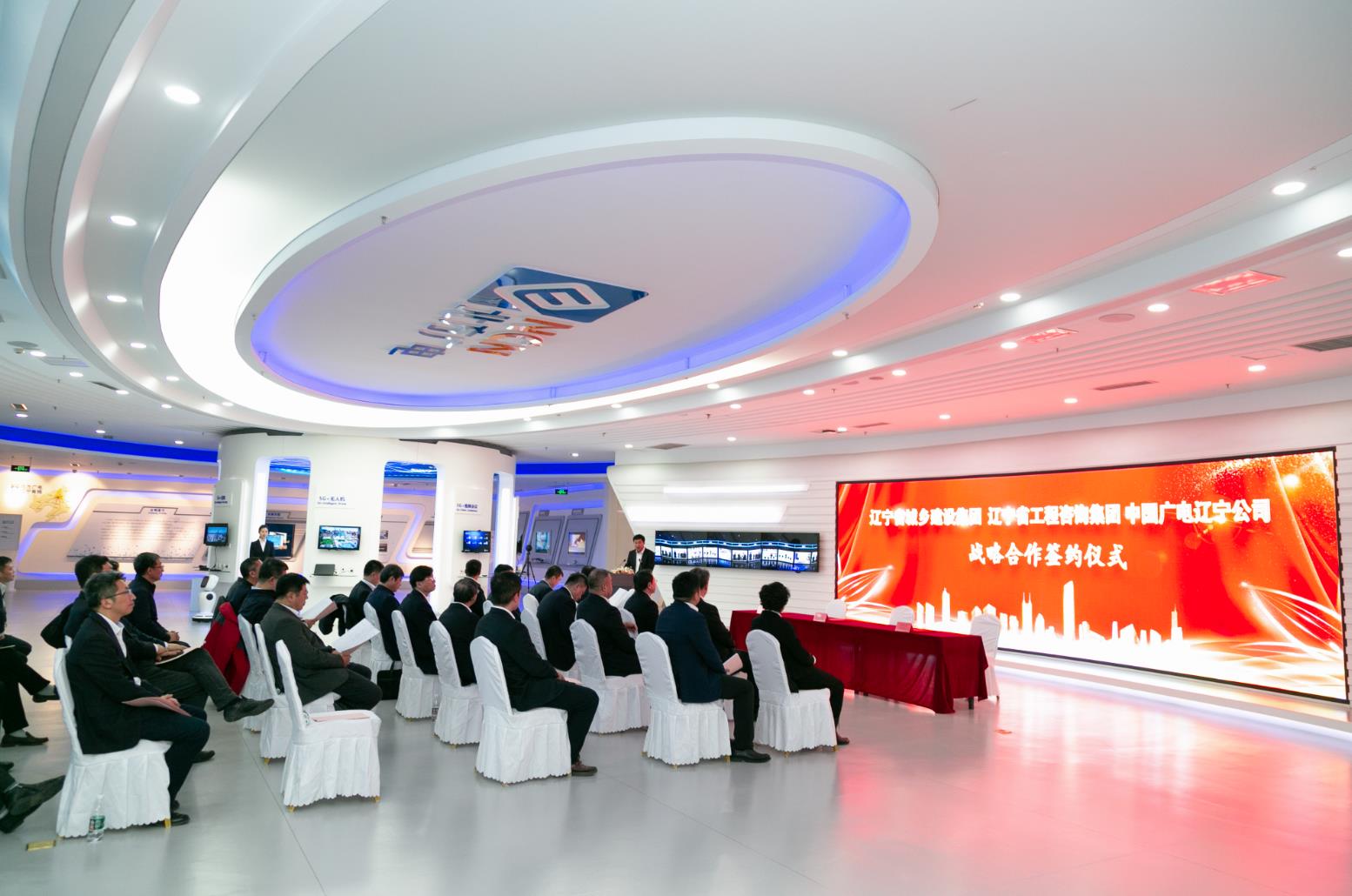 遼寧省城鄉建設集團工程建設與安全管理部部長楊振輝,設計咨詢管理部部長陳大偉,遼寧市政工程集團黨委書記、董事長王慶國,建筑設計院黨委書記、董事長王凱峰,省建設科研院黨委書記、董事長、總經理王元,省城鄉規劃院黨委書記、董事長張立鵬,省市政設計院黨委書記、董事長、總經理龐光輝;遼寧省工程咨詢集團總經理助理、遼寧工程招標有限公司執行董事、總經理李剛,總法律顧問、董秘、辦公室主任戚佳金,遼寧工程招標有限公司副總經理彭程;中國廣電遼寧公司黨委副書記蘇萬寶,副總經理張曉鈞,總工程師王兆恒,副總經理馬震,總經理助理李笑陽及公司相關職能部門負責人參加了簽約儀式。
