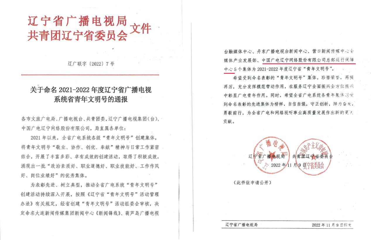 2021年以來,全省廣電系統各級“青年文明號”創建集體,將青年文明號“敬業、協作、創優、奉獻”精神與日常工作緊密結合,開展了豐富多彩、卓有成效的創建活動,取得了積極成效,涌現出一批“政治素質好、職業道德好、職業技能好、工作作風好、崗位業績好”的優秀集體。為表彰先進、樹立典型,推動全省廣電系統“青年文明號”創建活動持續深入開展,按照《遼寧省“青年文明號”活動管理辦法》有關規定,經省創建“青年文明號”活動組委會審核,遼寧省廣播電視局和共青團遼寧省委員會決定命名中國廣電遼寧公司總部運行保障中心等5個集體為2021-2022年度遼寧省“青年文明號”。