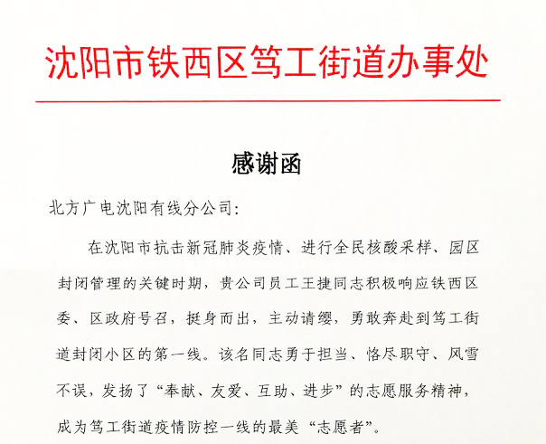1月19日,北方廣電網(wǎng)絡(luò)公司沈陽分公司接到沈陽市鐵西區(qū)篤工街道發(fā)來的感謝函,對公司員工王捷同志在沈陽市抗擊新冠疫情期間做出的突出貢獻(xiàn)表示由衷的感謝。