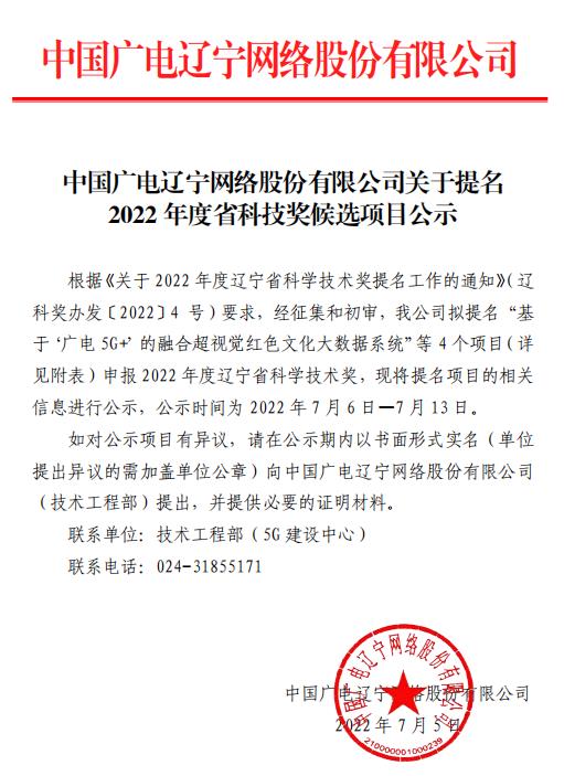 中國廣電遼寧網絡股份有限公司關于提名2022 年度省科技獎候選項目公示