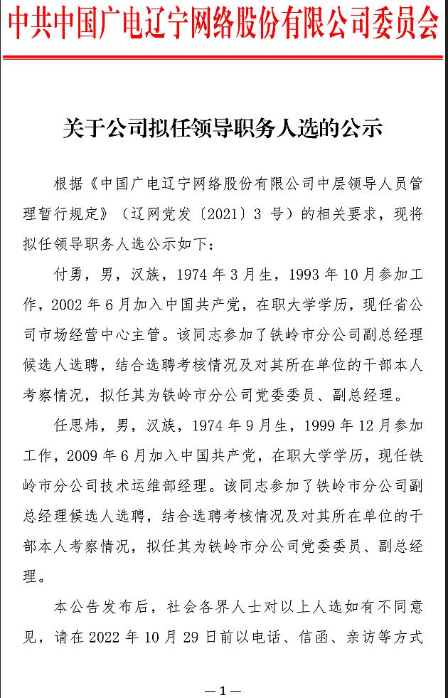 根據《中國廣電遼寧網絡股份有限公司中層領導人員管理暫行規定》(遼網黨發[2021]3號)的相關要求,現將擬任領導職務人選公示如下: