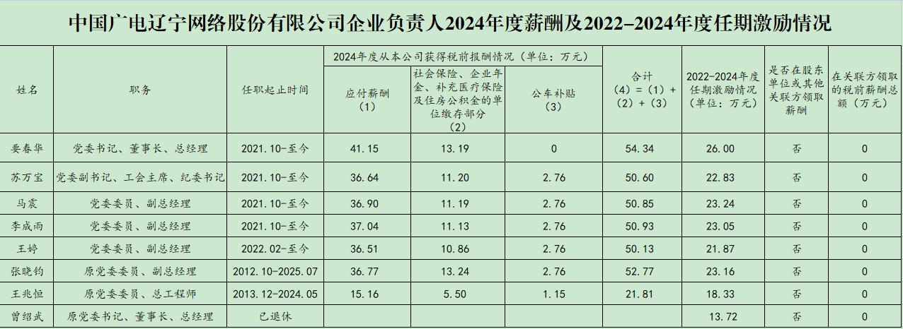 中國廣電遼寧網絡股份有限公司企業負責人2024年度薪酬及2022-2024年度任期激勵情況