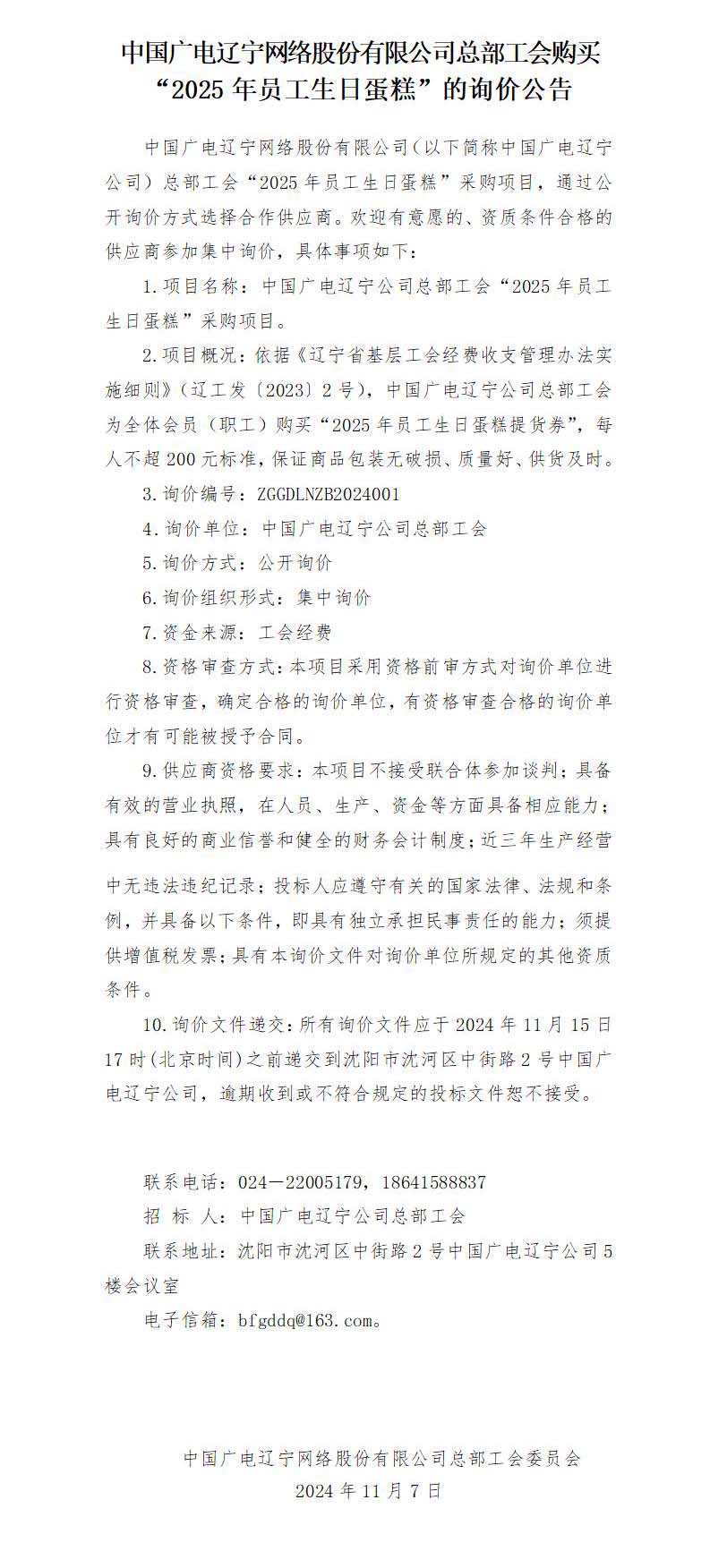 中國廣電遼寧網絡股份有限公司總部工會購買“2025年員工生日蛋糕”的詢價公告