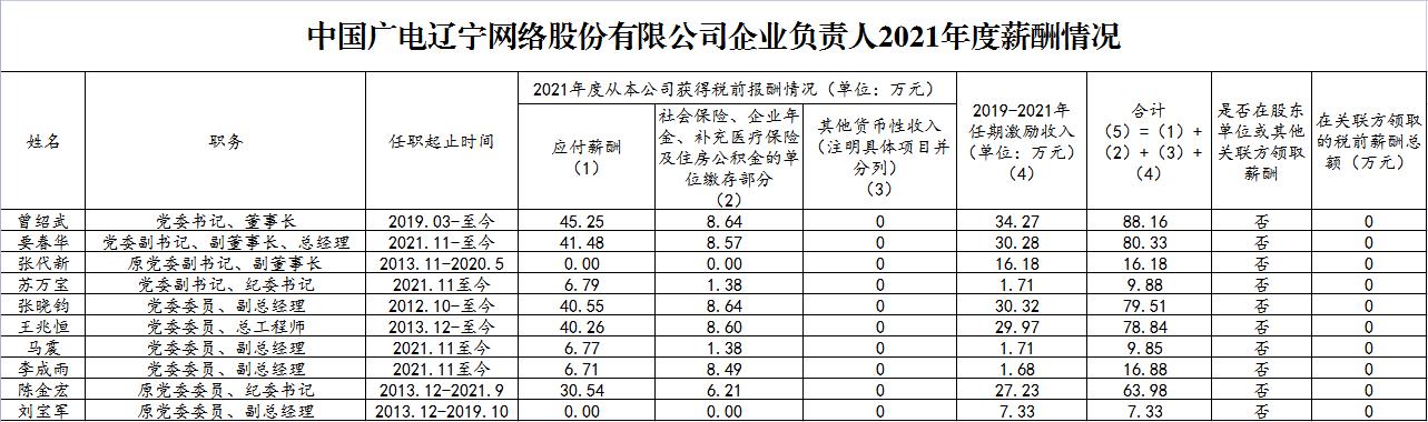 中國廣電遼寧公司2021年企業負責人薪酬公示