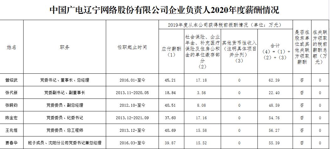中國廣電遼寧網絡股份有限公司企業負責人2020年度薪酬情況